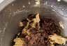 3. Voeg nu de bloem toe en mix langzaam tot een samenhangend koekdeeg. Dit deeg is stevig, maar hoort niet droog te zijn. Meng dan de stukjes gehakte chocolade paaseitjes door het deeg. Wikkel het deeg in folie en leg minimaal een half uurtje in de koelkast. Verwarm de oven op 180 graden.