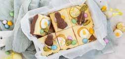 9. Laat ietsje afkoelen (in de koelkast) en begin daarna met het versieren van de fudge. Als de chocolade nog te heet is, smelt je paasversiering.