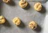 4. Pak telkens een klein bolletje deeg, ongeveer zo groot als een flinke walnoot, en leg op de bakplaat en druk dit ietsjes plat op de bakplaat. Laat voldoende ruimte tussen de koekjes, want ze lopen iets uit tijdens het bakken.