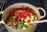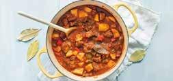 5. Snijd alvast de aardappelen en paprika’s in blokjes. Voeg deze na 2 uur sudderen toe en laat ongeveer nog 40 minuten mee pruttelen of tot de aardappelen gaar zijn. In totaal stooft de goulash ongeveer 2,5 tot 3 uur.
