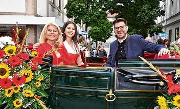 FroheMieneninderBrauereikutschebeimEinzug,vonlinks: MarisaundSophieSteegmüllervonderBräufamilieundGeschäftsführerLorenzStiglauer.