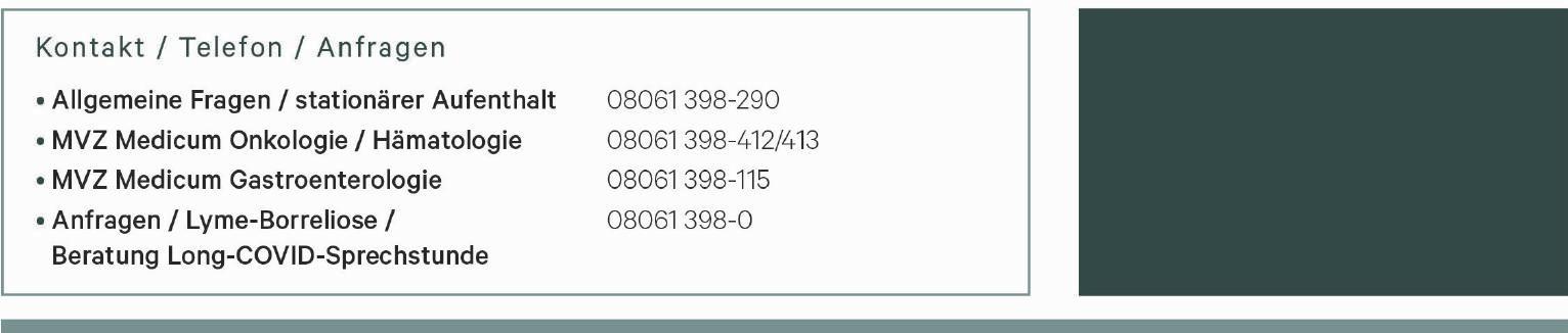 I n f e k t i o l o g i e . F ü r d i e U m s e t z u n g dieser p a t ient en o ri e n t i e rt e n Ver s org u n g s t e h t i m a m b u l a n t e n B e r e i c h ein Medizinisches Versorgungszentr u m m i t i n t e r n i s t i s c h e r V e r s o r g u n g , e i n e P r a x i s f ü r G a s t r o e n t e r o l o g i e eine Kassenpraxis für Onkologie und Hämatologie, sowie ein Zentrum für I n f e k t i o l o g i e m i t d e n S c h w e r p u n kt e n B o r r e l i o s e u n d L o n g - C O V I DB e h a n d l u n g z u r V e r f ü g u n g I m s t ationären Bereich werden vorwiegend onkologische Patienten nach dem Konzept der Integrativen Onkologie behandelt. Das bedeutet, dass neben den konventionellen Standardmethoden der Onkologie begleitend intensive unterstützende Maßnahmen aus den B e r e i c h e n d e r K o m p l e m e n t ä r m e d izin / Naturheilkunde, Ernährungsmedizin und Psychoonkologie, eingesetzt werden.