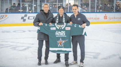 Von links: Christoph Sandner Geschäftsführer Starbulls Rosenheim; Florian Schiller, Geschäftsführer OVB24 GmbH; Darwin Kuhn, Leitung Sponsoring Starbulls Rosenheim Foto: Christoph Sinzinger