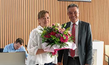 Bürgermeister Martin RiedlbeglückwünschtGeschäftsführerin AntoniaWeiß.