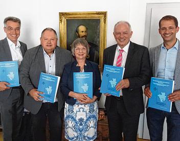 Bei derPräsentation des Buchs,von links: Landrat Otto Lede rer, der Direktor des Amtsgerichts Rosenheim Ralf Peter,Hel ga Gold,der Präsidentdes LandgerichtsProf. Dr.LudwigKro iß und OberbürgermeisterAndreas März.
