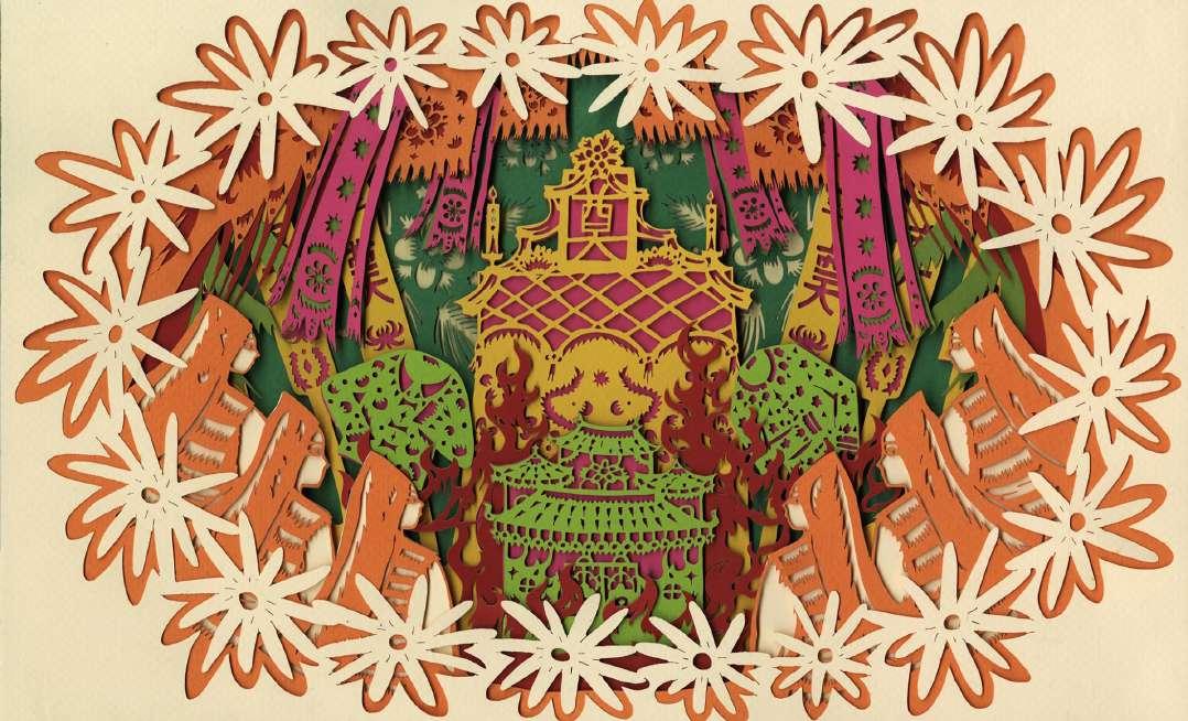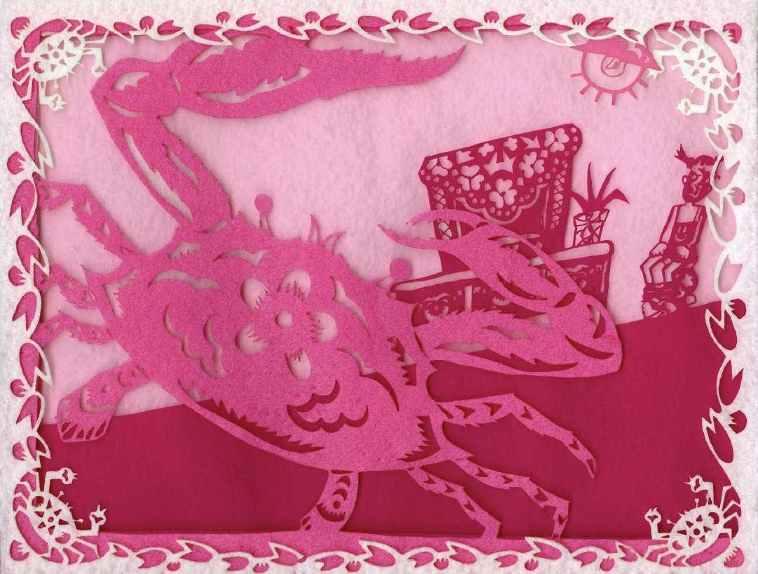 Cut paper. I feel like cut paper is a folk art. It was not considered an actual art practice in Ancient China. Everyday people cut paper and then put it on their window. So a lot of people do that. My mom’s friend was also a cut paper artist, so when I was very little, I learned how to cut paper from them. I was only in second grade, maybe. I did it for a little bit and stopped, but when I went to art school and I was given assignments and trying to problem solve, I just found myself slowly gravitating towards cut paper. l couldn’t explain it. Muscle memory or something keeps drawing me back to this way of making art. Because a lot of my inspirations come from folk art, and paper itself is already a part of this tradition, I can convey whatever I want a little more effectively than other mediums.