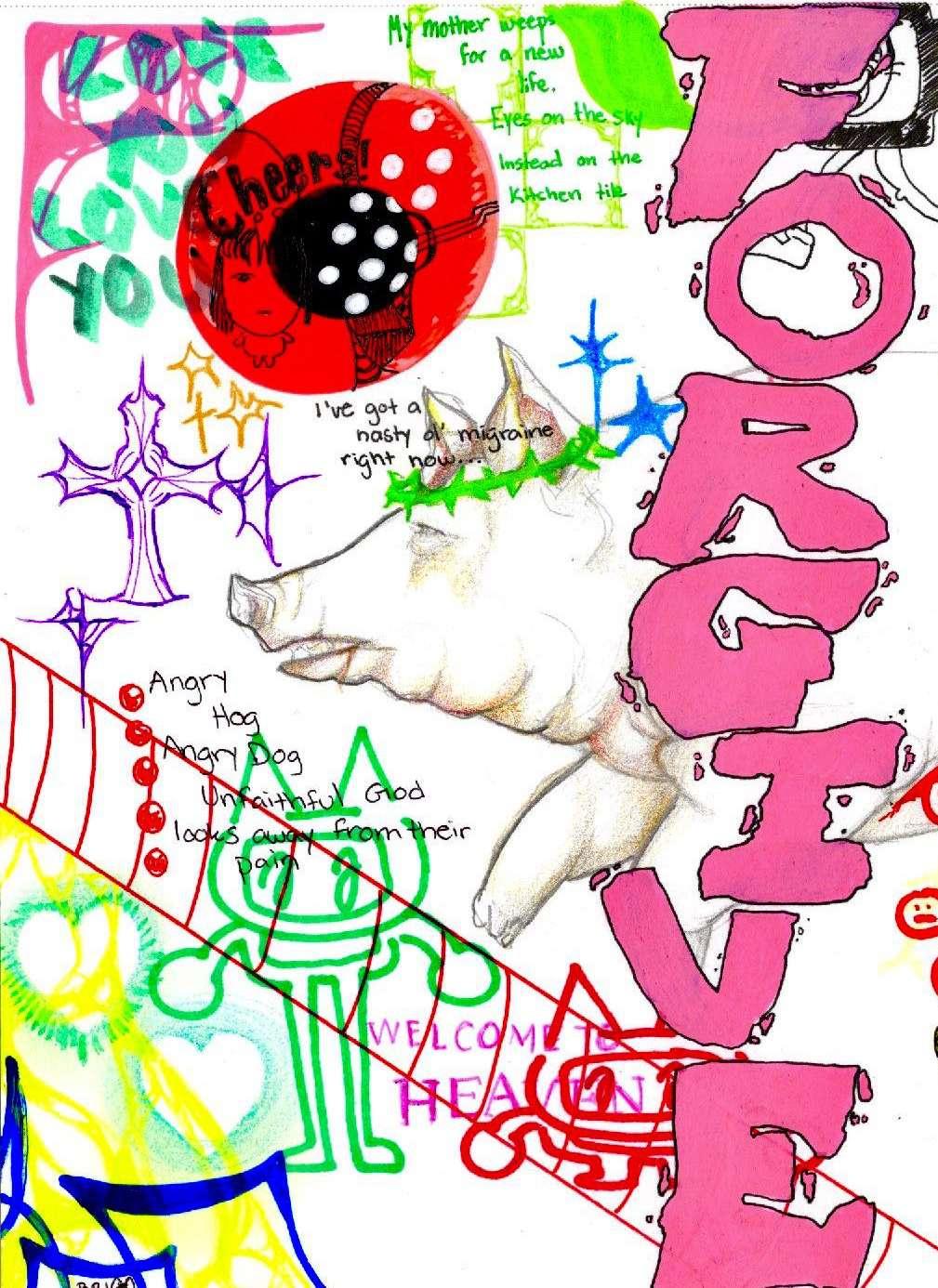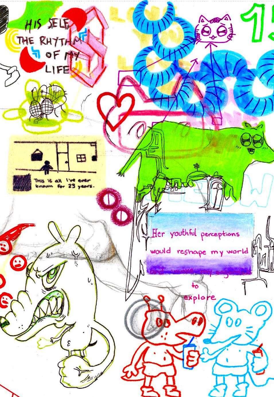 Lennon’s work aims to illustrate the messy and confusing transition from child to adult. She is a mixed media artist and writer that works primarily with garbage, pens, tape and memory-unpacking and remaining curious about shame’s twisted clutch.