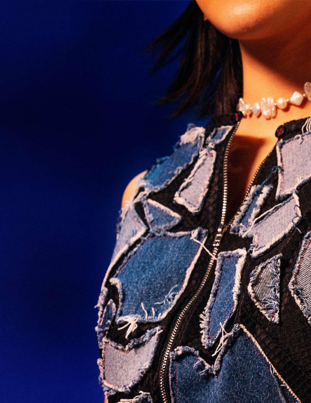 I have this top that I recently made using this technique called slashing. I stacked four layers of fabric together, sewed organic lines throughout it, and cut through all the layers with scissors, leaving the bottom [layer]. It created this really interesting texture and effect that I think looks very cathartic.