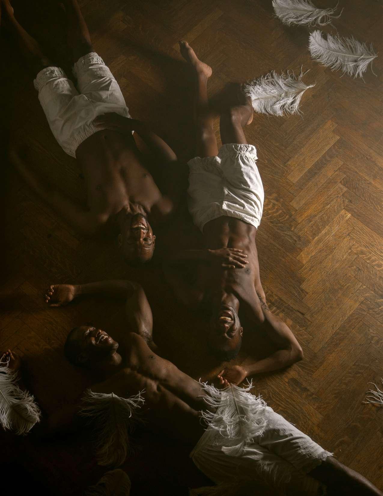The models look like statues—posed, curated, holding fragile wooden headpieces in their hands. Their posture feels controlled, restrained, socially acceptable, as though they are expected to remain still, to behave.