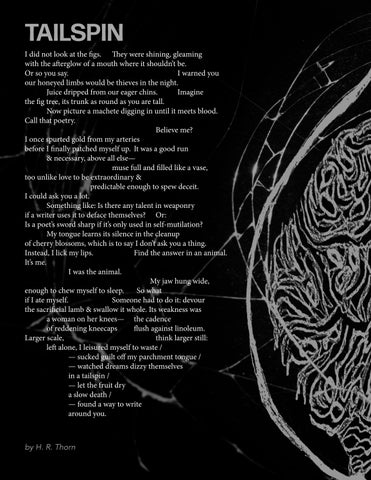 H.R. Thorn is a poet, editor, and current student at Emerson College pursuing a B.F.A. in creative writing in pursuit of her life passion of poetry. She seeks to unravel all of the raw edges of the human experience through her writing—the moments that propel visceral change. Other works of hers can be read in Dreamworldgirl zine, Dollheart zine, Flowermouth Press, and Dulcet Literary