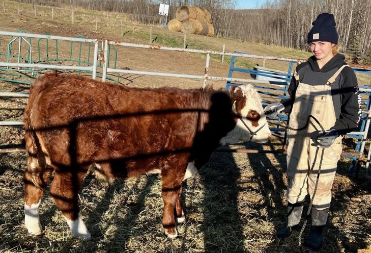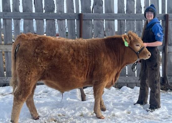 My name is Janine Smith, I’m 16 years old, and this is my 7th year in 4-H. This year, I am our club’s Vice-President. My steer’s name is Bruce. He is a Simmental/Angus cross I bought from my sister. At the beginning of March, Bruce weighed 1100 lbs. I also have a carcass steer Jasper, a yearling heifer Jenny, & a 3 year old cow and calf project, Clementine & Julien. I would like to send out a huge thank you to all the buyers who support our 4-H sale, especially 5 GEN CATTLE LTD. who bought my steer last year. We look forward to seeing you all in June!