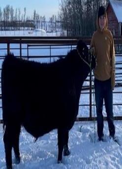 Hey there, my name is Wyatt Croll and this is my 5th year in 4-H. I would like to thank Ed and Vern at the CENTRAL ALBERTA HAY CENTER for purchasing my market steer in 2023. This is my current steer SirLoin, whom I bought off my Uncle Murry in the fall. He is a Charolais cross, and weighed in at 814lbs on November 5th. On March 1st he weighed 1300lbs and estimated to finish around 1600lbs. In addition to my market steer I also have a yearling heifer, carcass project and two cows expecting calves.