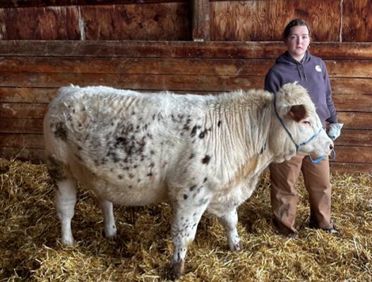 Hello my name is Paitence Boyce and this is my first year in 4-H. My Steer is a Speckle Park named 'George'. At weigh-In George weighed 480 lbs, on Feb. 3rd we estimated him to weigh 705lbs. At Sale date we are estimating him to be around 1100lbs.
