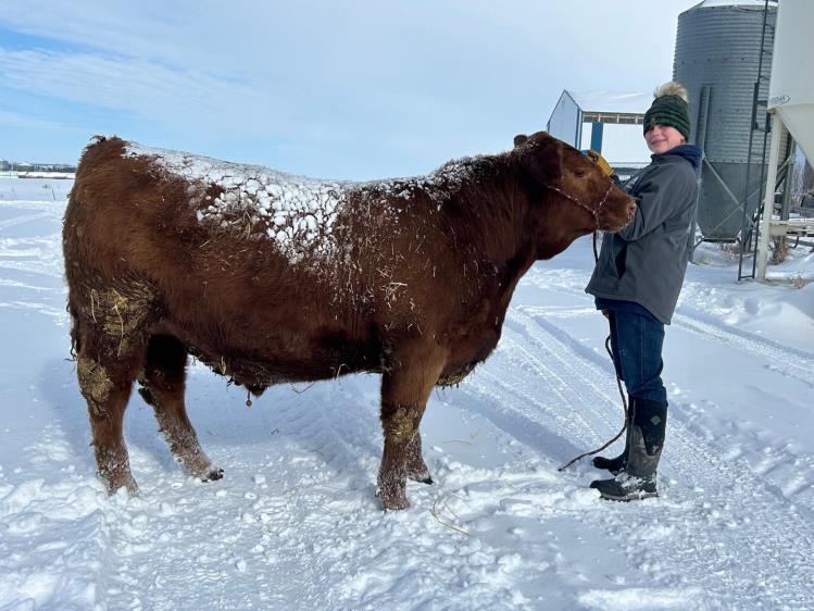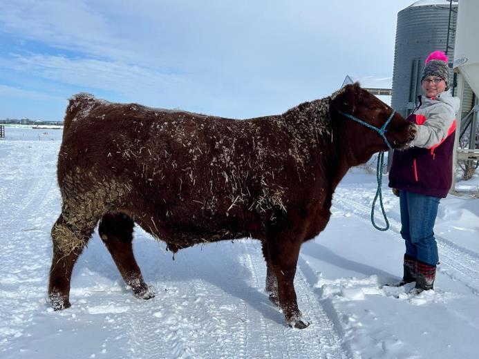 My name is Lily Swan and this is my 6th year in 4-H. I am in grade 11 and I am the treasurer for the Gilby Beef 4-H Club this year. I picked out this roan Hereford cross from my neighbour’s herd because I had been eying him up all summer and I liked his size and colour. I named him Sparky because he’s got a bit of an attitude. I think Sparky will reach about 1285 pounds for the show and sale in June. I feed him grain and hay twice a day with my brother’s steers. Thank you to my buyer BRAMALL OILFIELD HAULING LTD. for purchasing my steer from last year. Feeding, caring and training the steers all year is a lot of work, but my favourite part is always showing off the finished product at the end of the year at the show and sale! Hope to see you all there!