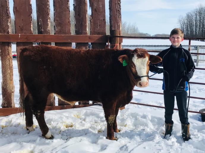Hi there, my name is Jaxson Pfahler I am 12 years old in grade 6 and in my third year of 4-H. This is my steer Bandit, he is a Hereford cross and he is very quiet and easy going. I picked him out from my neighbour’s herd and I think he will be my best steer yet. I go out and feed him grain and hay twice a day and I am predicting he will grow to be around 1370 pounds. I spend lots of time brushing my steer, and I am really looking forward to showing him off at the show and sale in June. Thank you to my buyer from last year SUMMIT STRATEGIES CHARTERED PROFESSIONAL ACCOUNTANTS for purchasing my steer last year! See you all in June!