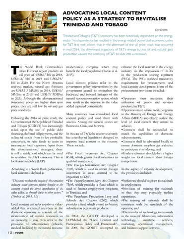 he World Bank Commodities Price Forecast report predicts an oil price of US$60/ bbl in 2018, US$61.5/ bbl in 2019 and US$62.9/ bbl in 2020. For the North America regional market, natural gas forecasts are US$3.5 / MMBtu in 2018, US$3.6/ MMBtu in 2019, and US$3.7/ MMBtu in 2020. Although the aforementioned forecasted prices are higher than spot prices, they are still low by oil and gas price standards. Following the 2014 oil price crash, the Government of the Republic of Trinidad and Tobago (GORTT) has increasingly relied upon the use of public debt financing, deferred bill payments, and the selling of stocks from its few profitable enterprises, to raise funds to assist in meeting its fiscal expenses. Apart from the aforementioned strategies, there is still a viable tool which can be used to revitalize the T&T economy. This is local content policy (LCP). According to a World Bank publication, local content is defined as “The extent to which the output of the extractive industry sector generates further benefits to the economy beyond the direct contribution of its value-added, as through links to other sectors.” (Tordo et al. 2013, 13). Local content can refer to jobs or valueadded that is created anywhere in the domestic economy as a result of the monetization of natural resources in an economy. It may even refer to the provision of infrastructure (schools, medical facilities) by the natural resource