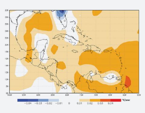 An assessment of SST in the Caribbean between the period 1982-2016 shows that SST have warmed at a rate of between 0.01°C and 0.04°C annually, with higher rates of warming observed in the Gulf of Mexico and the eastern Caribbean extending into the eastern tropical Atlantic (figure 1) (Climate Studies Group Mona (Eds.), 2020).