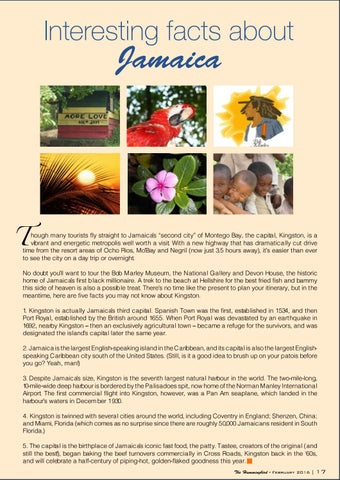 hough many tourists fly straight to Jamaicaâs âsecond cityâ of Montego Bay, the capital, Kingston, is a vibrant and energetic metropolis well worth a visit. With a new highway that has dramatically cut drive time from the resort areas of Ocho Rios, MoâBay and Negril (now just 3.5 hours away), itâs easier than ever to see the city on a day trip or overnight. No doubt youâll want to tour the Bob Marley Museum, the National Gallery and Devon House, the historic home of Jamaicaâs first black millionaire. A trek to the beach at Hellshire for the best fried fish and bammy this side of heaven is also a possible treat. Thereâs no time like the present to plan your itinerary, but in the meantime, here are five facts you may not know about Kingston. 1. Kingston is actually Jamaicaâs third capital. Spanish Town was the first, established in 1534, and then Port Royal, established by the British around 1655. When Port Royal was devastated by an earthquake in 1692, nearby Kingston â then an exclusively agricultural town â became a refuge for the survivors, and was designated the islandâs capital later the same year. 2. Jamaica is the largest English-speaking island in the Caribbean, and its capital is also the largest Englishspeaking Caribbean city south of the United States. (Still, is it a good idea to brush up on your patois before you go? Yeah, man!) 3. Despite Jamaicaâs size, Kingston is the seventh largest natural harbour in the world. The two-mile-long, 10-mile-wide deep harbour is bordered by the Palisadoes spit, now home of the Norman Manley International Airport. The first commercial flight into Kingston, however, was a Pan Am seaplane, which landed in the harbourâs waters in Decem ber 1930. 4. Kingston is twinned with several cities around the world, including Coventry in England; Shenzen, China; and Miami, Florida (which comes as no surprise since there are roughly 50,000 Jamaicans resident in South Florida.) 5. The capital is the birthplace of Jamaicaâs iconic fast food, the patty. Tastee, creators of the original (and still the best!), began baking the beef turnovers commercially in Cross Roads, Kingston back in the â60s, and will celebrate a half-century of piping-hot, golden-flaked goodness this year. The Hummingbird - February 2016 |