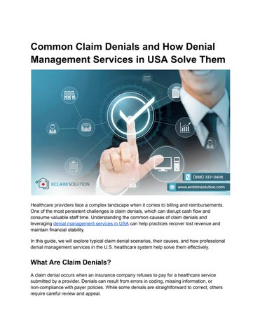 eClaimSolution delivers expert denial management services in USA, helping healthcare providers reduce claim rejections, improve reimbursements, and streamline revenue cycles. From identifying root causes to timely resubmissions, our team ensures accuracy and maximizes collections for practices of all sizes.