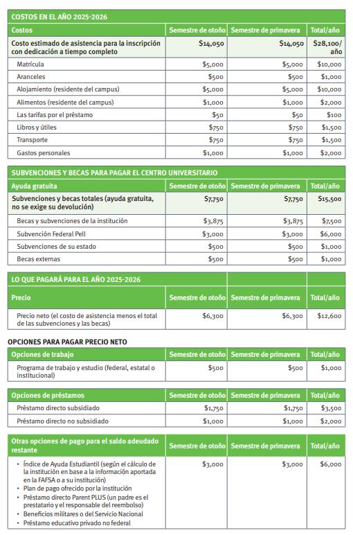 Opciones de ayuda financiera: ¿El centro universitario ofrece un plan de pago de matrícula en cuotas o un costo de asistencia garantizado mientras esté inscrito?