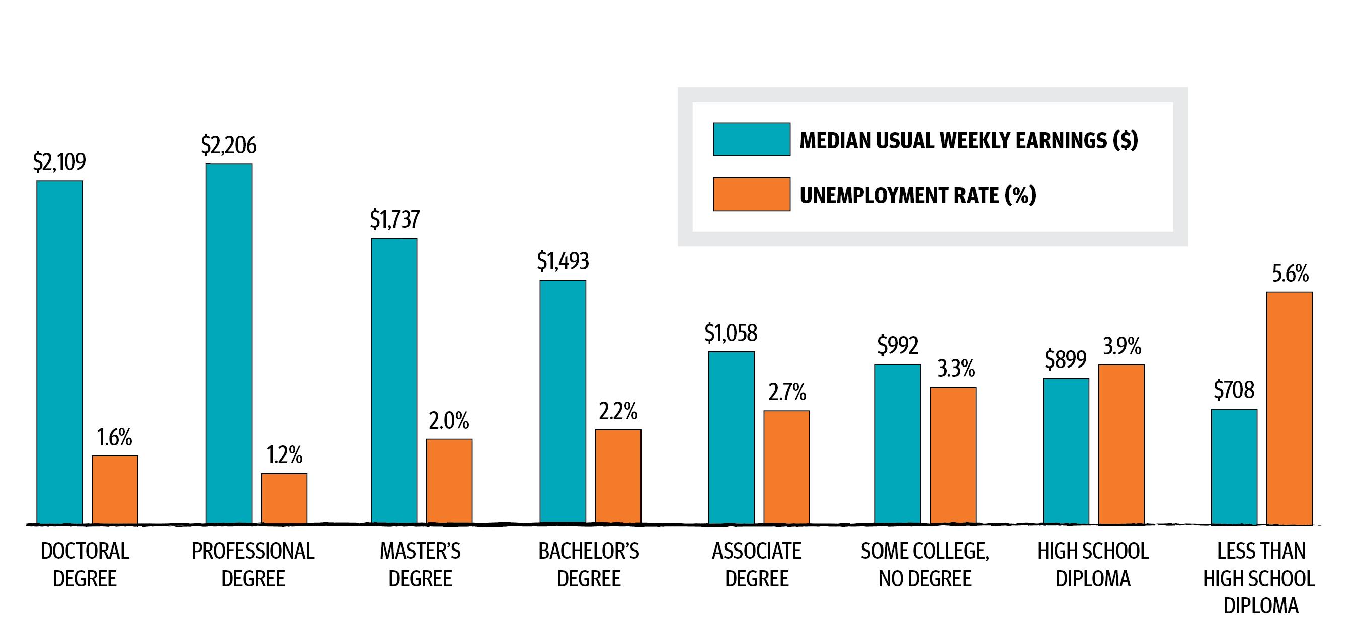 Fuente: “Encuesta de la población actual 2024”, Oficina de Estadísticas Laborales de EE. UU. www.bls.gov/emp/chart-unemployment-earnings-education.htm.