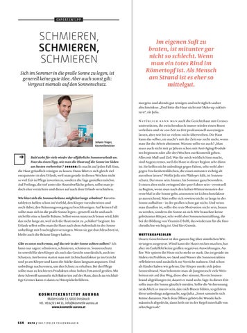 N a t ü r l i c h k a n n m a n auch die Gesichtshaut mit Cremes unterstützen, ihr zwischendurch immer wieder einen Boost verleihen und sie von Zeit zu Zeit professionell ausreinigen lassen, aber wie bei so vielem: nicht übertreiben. Die Haut kann das selber, sie macht’s mit der Zeit nur nicht mehr, wenn man ihr die Arbeit abnimmt. Warum sollte sie auch? „Man muss auch nicht mit 30 Jahren schon mit Anti-Aging-Produkten beginnen oder alle drei Wochen zur Kosmetik gehen. Alles mit Maß und Ziel. Was für mich wirklich Sinn macht, sind Augencremes, weil die Haut in dieser Region sehr dünn ist. Sie helfen nicht unbedingt gegen Falten, sehr wohl aber gegen Trockenheitsfältchen, die einen mitunter richtig alt aussehen lassen.“ Wofür Julia ein Plädoyer hält, ist Sonnenschutz. Der muss sein. Immer. Im Sommer ganz besonders. Es muss aber nicht zwingend der 50er-Faktor sein – eventuell zu Beginn, wenn man nach den kalten Wintermonaten das erste Mal in die Sonne geht, ansonsten ist Lichtschutzfaktor 30 ausreichend. Man sollte sich sowieso nicht zu lange in der Sonne aufhalten – in der prallen schon gar nicht. Und wenn man draußen ist, sollte die erste Motivation nicht sein, braun zu werden, sondern die Sonne an sich. Wir brauchen keine gebräunten Körper, sehr wohl aber Sonneneinstrahlung, die bei der Bildung von Vitamin D hilft, das wiederum für die Knochendichte wichtig ist. Und fürs Gemüt.