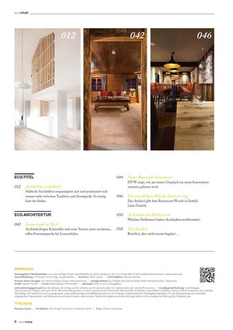 IMPRESSUM Herausgeber & Medieninhaber: eco.nova Verlags GmbH, Hunoldstraße 20, 6020 Innsbruck, Tel.: 0512/290088, E-Mail: redaktion@econova.at, www.econova.at Geschäftsleitung: Christoph Loreck, Mag. Sandra Nardin // Assistenz: Ruth Loreck // Chefredaktion: Marina Kremser Autoren dieser Ausgabe: DI Caterina Molzer-Sauper, Marina Kremser // Anzeigenverkauf: Ing. Christian Senn, Bruno König, Martin Weissenbrunner, Tanja Ischia Grafik: Sophie Frenzel // Druck: Radin-Berger-Print GmbH // Jahresabo: EUR 25,00 (14 Ausgaben) Unternehmensgegenstand: Die Herstellung, der Verlag und der Vertrieb von Drucksorten aller Art, insbesondere der Zeitschrift eco.nova. // Grundlegende Richtung: Unabhängiges österreichweites Magazin, das sich mit der Berichterstattung über Trends in den Bereichen Wirtschaft, Wissenschaft, Architektur, Gesundheit & Wellness, Steuern, Recht, Kulinarium und Lifestyle beschäftigt. Der Nachdruck, auch auszugsweise, sowie anderwertige Vervielfältigung sind nur mit vorheriger Zustimmung des Herausgebers gestattet. Für die Rücksendung von unverlangt eingesandten Manuskripten und Bildmaterial wird keine Gewähr übernommen. Namentlich gekennzeichnete Beiträge stellen nicht unbedingt die Meinung der Redaktion dar.