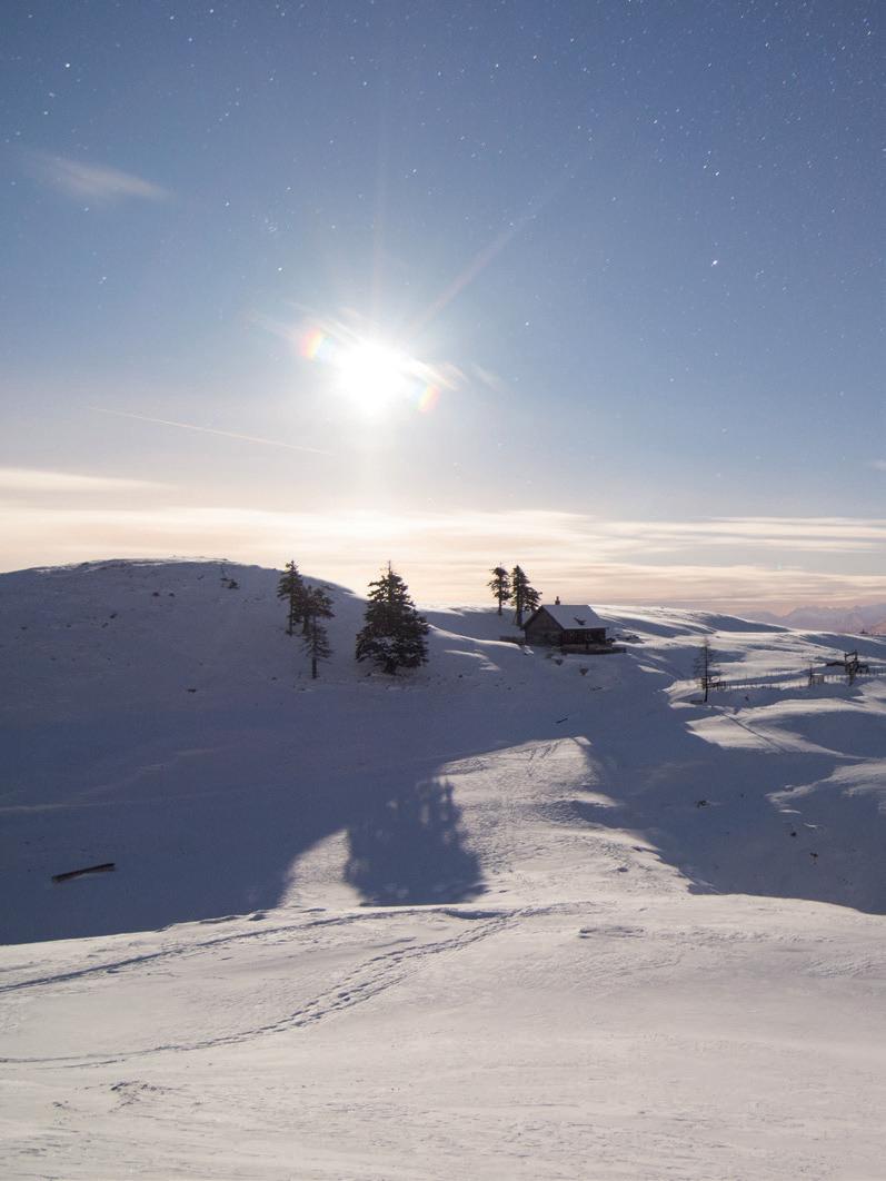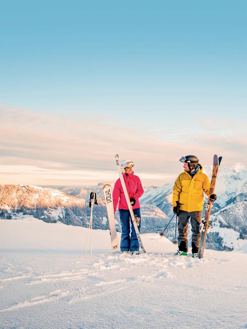 I mmer mehr Wintersportbegeisterte entdecken auch das Skitourengehen für sich. Die Vorteile: Man ist unabhängig von jedem Lift und jeder Gondel, darf das Tempo der Tour selbst bestimmen und kann aus eigener Kraft den Berg bezwingen – ein erhebendes Gefühl. Setzt man nach geschafftem Anstieg auf den Skiern zur Talfahrt an, hat man die perfekte Kombination aus naturnahem, geradezu meditativem Konditionstraining und rasantem, anregendem Höhenflug. Wer dazwischen noch eine kurze Verschnaufpause braucht, kann seine Route entsprechend anpassen und eine der vielen Hütten der Region ansteuern.