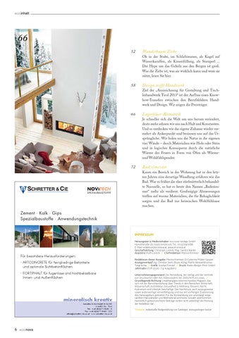Herausgeber & Medieninhaber: eco.nova Verlags GmbH Hunoldstraße 20, 6020 Innsbruck, Tel.: 0512/290088, E-Mail: redaktion@econova.at, www.econova.at Geschäftsleitung: Christoph Loreck, Mag. Sandra Nardin Assistenz: Ruth Loreck // Chefredaktion: Marina Kremser Redakteure dieser Ausgabe: Marina Kremser, DI Caterina Molzer-Sauper Anzeigenverkauf: Ing. Christian Senn, Bruno König, Martin Weissenbrunner, Tanja Ischia // Grafik: Sophie Frenzel // Druck: Radin-Berger-Print GmbH Jahresabo: EUR 25,00 (14 Ausgaben) Unternehmensgegenstand: Die Herstellung, der Verlag und der Vertrieb von Drucksorten aller Art, insbesondere der Zeitschrift eco.nova. // Grundlegende Richtung: Unabhängiges österreichweites Magazin, das sich mit der Berichterstattung über Trends in den Bereichen Wirtschaft, Wissenschaft, Architektur, Gesundheit & Wellness, Steuern, Recht, Kulinarium und Lifestyle beschäftigt. Der Nachdruck, auch auszugsweise, sowie anderwertige Vervielfältigung sind nur mit vorheriger Zustimmung des Herausgebers gestattet. Für die Rücksendung von unverlangt eingesandten Manuskripten und Bildmaterial wird keine Gewähr übernommen. Namentlich gekennzeichnete Beiträge stellen nicht unbedingt die Meinung der Redaktion dar. Titelseite: Individuelle Badgestaltung von Gasteiger, www.gasteiger-bad.at