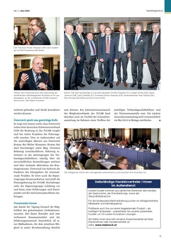 Österreich spielt eine gewichtige Rolle Es zeigt sich immer mehr, dass Österreich neben dem deutschen Schwesternverband CDH die Richtung in der IUCAB vorgibt und bei vielen Projekten die Führungsrolle innehat. Dies ist insbesondere auf die umtriebigen Akteure aus Österreich Komm.-Rat Walter Krammer, Komm.-Rat Axel Sturmberger sowie Mag. Christian Rebernig zurückzuführen. Rebernig informiert in der Arbeitsgruppe der Verbandsgeschäftsführer ständig über die wirtschaftlichen Entwicklungen weltweit und über laufende Aktivitäten des Bundesgremiums. Österreich hat dadurch die Funktion des Ideengebers für internationale Projekte. Er leitet auch die Expertengruppe Kommunikation und prüft die Finanzgebarung der IUCAB. Sturmberger steht der Expertengruppe Lobbying vor und kann seine Erfahrungen und Standpunkte auf der internationalen Ebene einbringen. Voneinander lernen Am Rande der Tagung bestand die Möglichkeit des gemeinsamen Gedankenaustausches. Ziel dieser Kontakte sind eine verbesserte Zusammenarbeit und der Erfahrungsaustausch hinsichtlich all jener Maßnahmen, die dem einzelnen Mitglied in seiner Berufsausübung dienlich