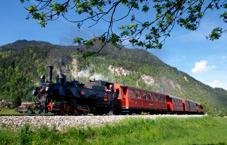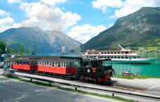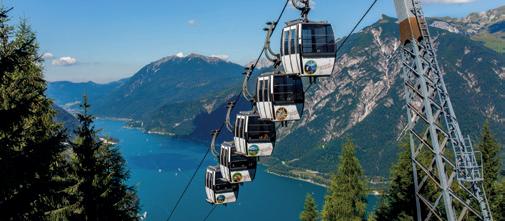 Wer lieber hoch hinaus will, der nimmt die AchenseeZahnradbahn. Seit 1889 dampft die Achenseebahn von Jenbach zum größten See Tirols. Auf einer Gesamtstrecke von 6,7 Kilometern geht’s erst einmal bergauf. Die Fahrt mit einer Steigung von bis zu 16 Prozent führt vom Inntal durch wildromantische Wälder und gewährt immer wieder herrliche Ausblicke auf die Tiroler Landschaft. Die 440 Höhenmeter bis Eben überwindet die Bahn im Zahnradbetrieb. Dabei lässt man die Hektik des Alltags hinter sich und entschleunigt auf einer einzigartigen Zeitreise.