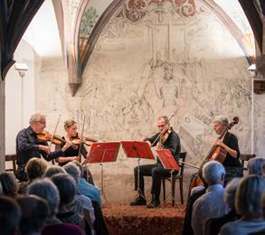 Traditionell musizieren bei den Schwazer Serenaden die vielfältigen Ensembles im 1517 erbauten und von Pater Wilhelm von Schwaben mit Fresken zur Gänze ausgemalten gotischen Franziskaner-Kreuzgang im Herzen des Franziskanerklosters Schwaz in einem wundervollen Ambiente.