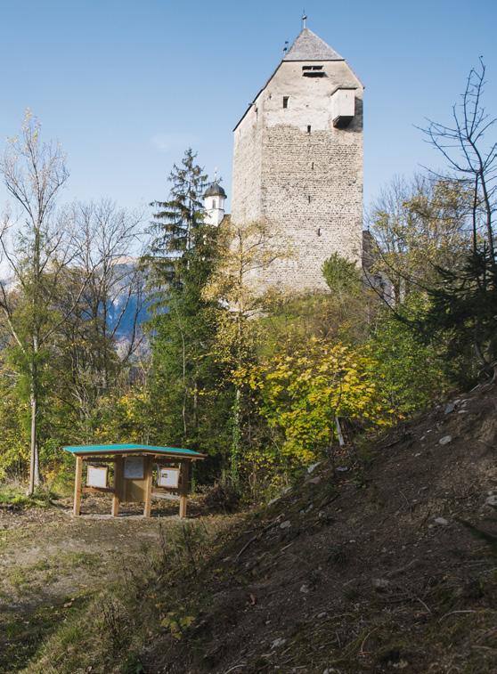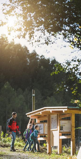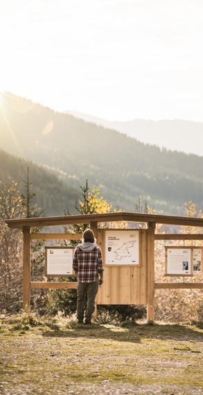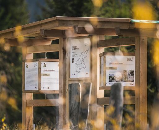 ➸ ENTLANG DER STRECKENFÜHRUNG ist in jeder der zwölf Gemeinden der Silberregion Karwendel eine Informationsstation zu finden. Am Würfel rechts stehen die Infos für Jugendliche und Erwachsene, links für Kinder – in kindgerechter Sprache und auf den ersten Blick erkennbar an Maskottchen Karwendolin. Neben Informationen und Geschichten zu den jeweiligen Gemeinden werden auch Inhalte des Films „Im Silberreich – Im Netz der Fugger“ vermittelt.