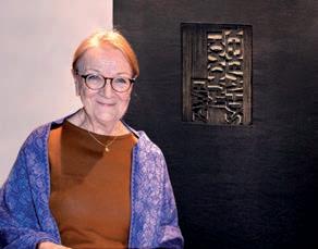 Irmgard Hofer-Wolf mit ihrem Werk „Sprachgitter“, Schauplatz eines möglichen Zwiegesprächs (Tüllstickerei, 2025), inspiriert von Paul Celans Gedicht von 1957