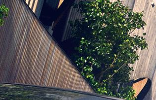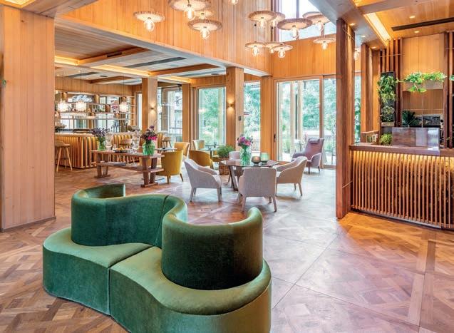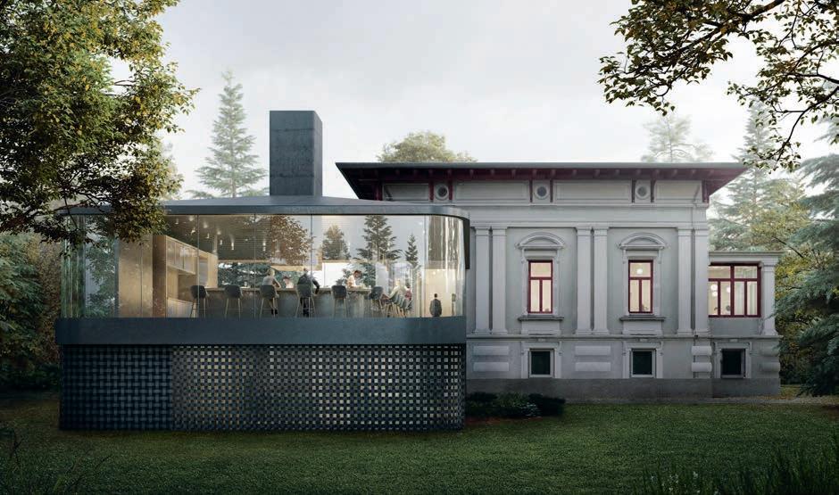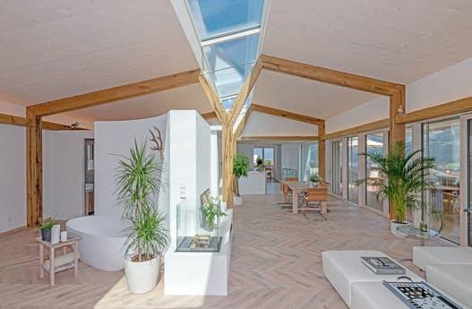 Übergänge von innen nach außen schafft. Ein besonderes Highlight des Projekts ist die sichtbare Dachkonstruktion, die das Dach in zwei Flügel teilt und somit eine ewige Weite bis in den Himmel gegeben ist.