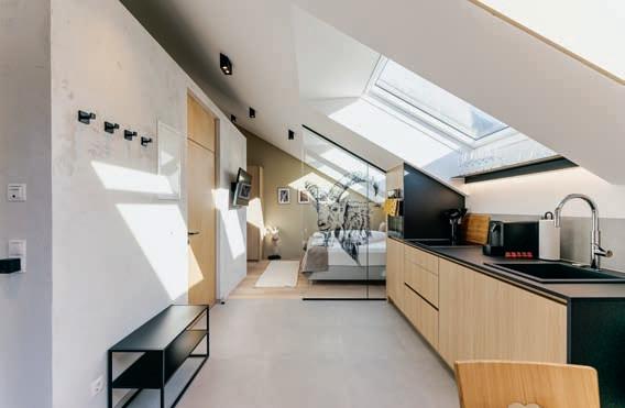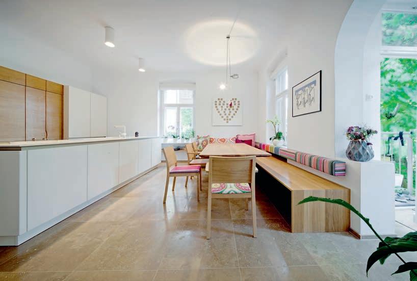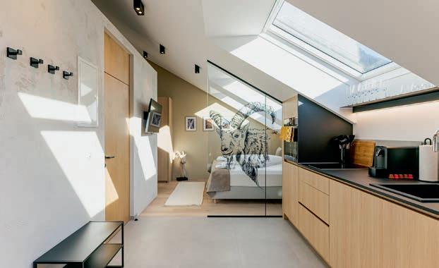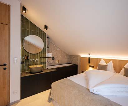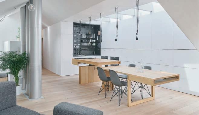 tektonischen Lösung, zu einem vorbildhaften Beispiel für einen zeitgemäßen Umgang mit historischer Bausubstanz. „Es war ein Riesenglück und ein Traum für mich als Architekt, einen erschwinglichen Dachboden ausbauen zu dürfen. Neben Boden und Wänden konnten wir eben auch das Dach mitgestalten. Für uns war auch die Lage sehr wichtig – kurze Wege des alltäglichen Lebens sind per Fuß und Fahrrad erreichbar und dennoch lebt sich’s in Hötting ein wenig dörflich. Wir wohnen unterm Dach, wo die Sonnenstrahlen Figuren an die Wand zeichnen. Hier ist alles schräg – nicht nur die Dachflächen. Am Dach wachsen die Kräuter, in der Wohnung die Kinder. Im Wesentlichen geht es um Behaglichkeit. Dazu zählen die Qualität der verwendeten Materialien und Oberflächen sowie die Inszenierung von Licht. Auch die Angemessenheit von Raumgrößen und Proportionen wirkt sich auf die Behaglichkeit aus und dabei kommt es nicht auf die Größe an. Neben all den gestalterischen Themen sollte selbstverständlich die Alltagstauglichkeit auch noch passen. Die Kinder würden sich im Traumhaus noch einen Turnsaal, eine Werkstatt und ein Atelier wünschen, ein Haustier wäre auch noch gut. Meine Frau hätte manchmal gerne einen Garten und ich hätte am liebsten das ganze Jahr über lange Tage mit viel Sonnenlicht, also eigentlich immer Sommer. Lieblingsplätze gibt es mehrere. Unseren Esstisch mit vielen Menschen drum herum mag ich schon ganz gerne, aber auch unsere Hängematte, wo ich ganz alleine bin.“ www.heunddu.me