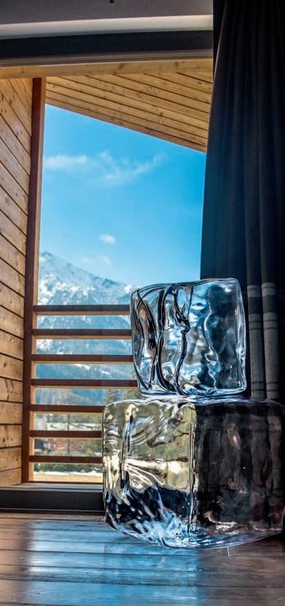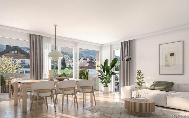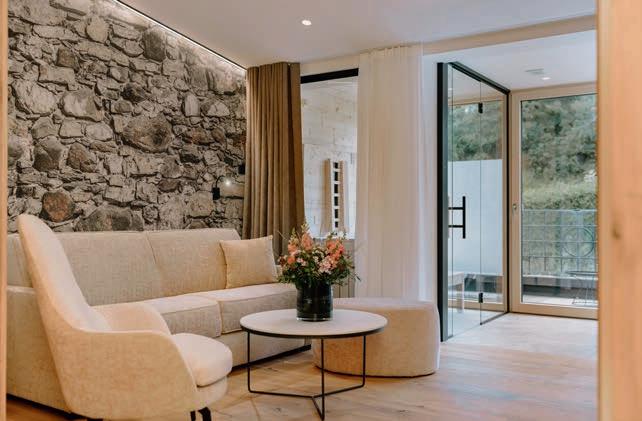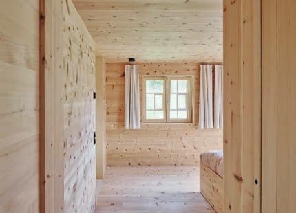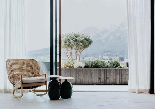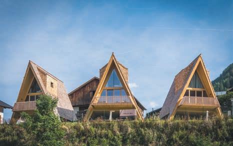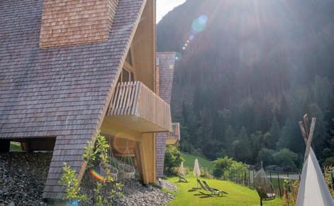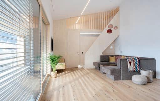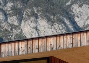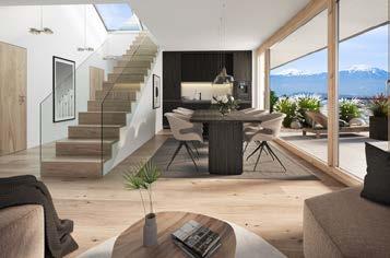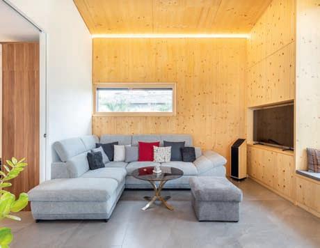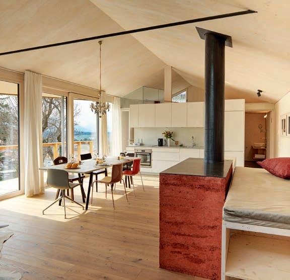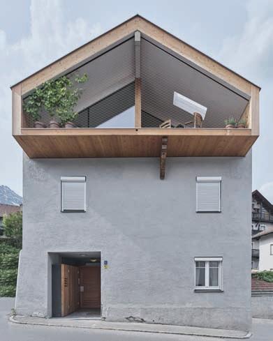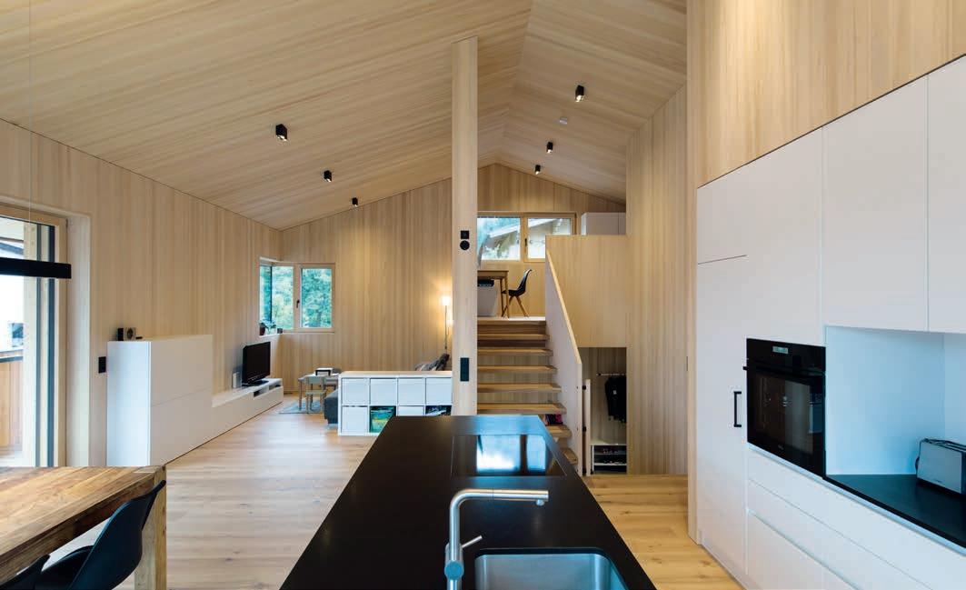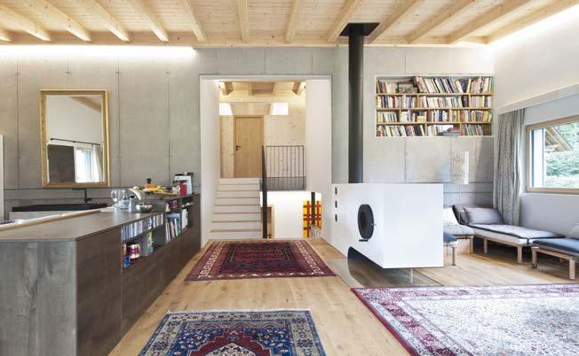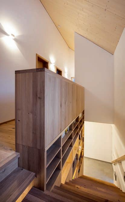 gebungsflächen. Der Baukörper in Massivholzbauweise mit Satteldach ist in sich geschlossen und kompakt, weist nordseitig eine Einbuchtung für die Zugänge und südlich eine Einbuchtung für die gemeinsame, großzügige Terrasse auf. Die energieeffiziente Haustechnik erfolgt mittels einer Luftwärmepumpe, die mit einer Photovoltaikanlage kombiniert wurde. „Mir ist Ruhe das Allerwichtigste beim Wohnen. Ich würde unser Haus als lichtdurchflutete Wohnkapelle beschreiben, wobei der Innenbereich so konzipiert ist, dass die Nordseite mit Bädern und Schlafräumen mit einer Raumhöhe von 260 Zentimetern überdeckt wurde und die Südseite mit ihren Wohnräumen bis unters Dach reicht und mit nordseitigen Juchees, sprich offenen Dachräumen, eine kapellenartige Großzügigkeit erfährt. Die Fensteröffnungen sind je nach Bedürfnissen beispielsweise in Kochhöhe oder mit Blick auf die umliegende Bergwelt höhenverschieden und schlitzartig gesetzt und nach Süden hin großformatig geöffnet. Die teils durch Oberlichten miteinander verbundenen Innenräume wurden mittels Podesten und versteckten Nebentreppen skulptural gestaltet, womit auch eine flexible Mehrfachnutzung der verschiedenen Wohnebenen möglich ist. Der gesamte Baukörper öffnet sich nach Süden hin, geht über die Wohnterrasse in das Gartengrün über und ‚rinnt‘ über eine Wildwuchsböschung in das anschließende Feld aus. Mein Phantasiehaus kommt diesem sehr nahe, ich würde im Traum eventuell noch autochthoner, unauffälliger und in totaler Verschmelzung mit dem Gelände leben.“ www.peterraneburger.com