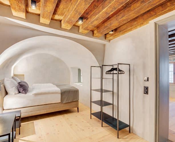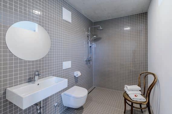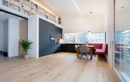 stück ein „Familyprojekt“ entstehen – ebenerdig, behindertengerecht, in ökologischer Bauweise und architektonisch anspruchsvoll, jedoch reduziert und autochthon, also möglichst regional. Trotz der sparsamen Nutzfläche ist besonders der Wohnbereich der Töchter ein wahres Raumwunder und kann bei Bedarf bis zu zehn Gäste beherbergen. Eiche und weiß geölte Fichte sowie geschliffener, anthrazitfarbener Estrich stehen im Mittelpunkt der hellen Um-