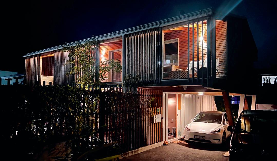 Wenn ein Architekt sein eigenes Wohnhaus mit Bürobereich als Referenzprojekt plant, sind sowohl private Besucher*innen als auch Kund*innen willkommen und können den speziellen Hybridbau gerne begutachten. Das erst kürzlich fertiggestellte Haus von Architekt Bernhard Desing besteht aus zwei ineinandergreifenden Baukörpern mit unterschiedlicher Formensprache und Materialisierung. Der südlich gelegene Holzbau-Teil mit Satteldach beherbergt die Funktionen Wohnen, Essen und Kochen, während Arbeiten, Schlafen, Bad und Abstellraum/Technik im Massivbau-Teil dahinter angeordnet sind. Der großzügige Wohnraum mit erhöhter Raumhöhe erweitert sich über große Glasflächen nach außen hin zur Terrasse und gibt den Blick frei auf die Berge. Die Wohnfunktionen sind klar zoniert und angemessen dimensioniert, alles ist kompakt auf einer Ebene angeordnet, die Wege sind kurz, kein Raum ist zu viel oder zu wenig, keine Flächen gehen für irgendwelche Erschließungsgänge verloren.