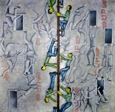 hein wachinger, „Der Weg nach OBEN“ 2023, Öl auf Malpappe, Abfallholz geschnitzt, 70 x 70 cm, GALARTERY fine art, Innsbruck