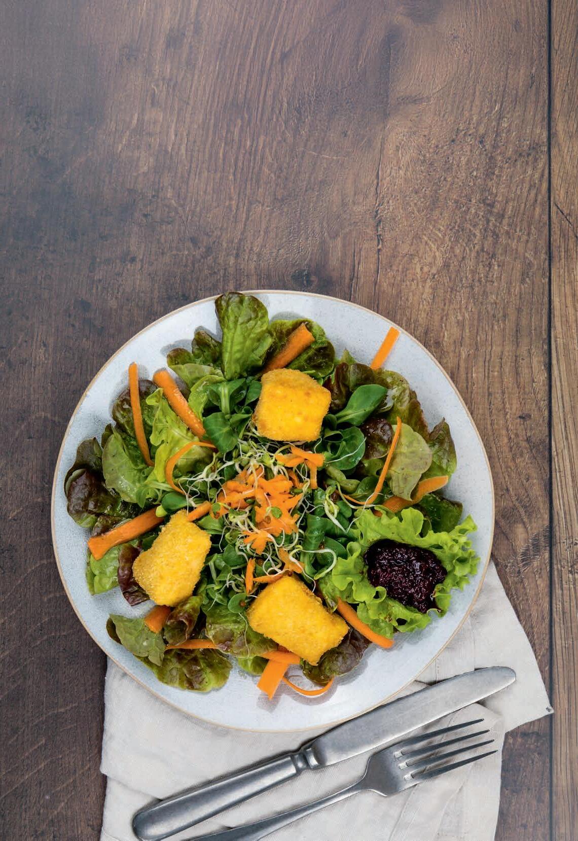 » Butterschmalz in einem Topf erhitzen und den Camembert schwimmend auf beiden Seiten goldbraun backen. Den Camembert etwas abtropfen lassen und mit dem Salat noch heiß servieren.