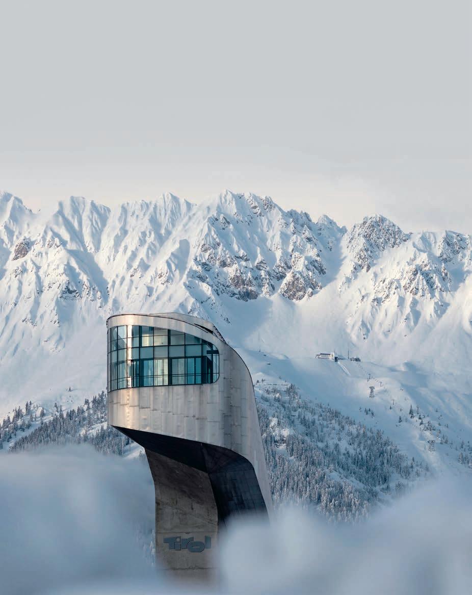 Einer silbernen Kobra gleich erhebt sich die Bergiselschanze hoch über die Stadt. Entworfen von Stararchitektin Zaha Hadid, wurde die Schanze nach dem Abriss der alten im Jahr 2002 neu aufgebaut. Am Bild gleitet der Blick auf die gegenüberliegende Talseite, hinauf auf die Seegrube im Norden der Stadt.