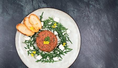 » Rucola waschen und auf einem Teller verteilen. Das Tatar auf dem Rucola anrichten und mit getoastetem Baguette servieren.