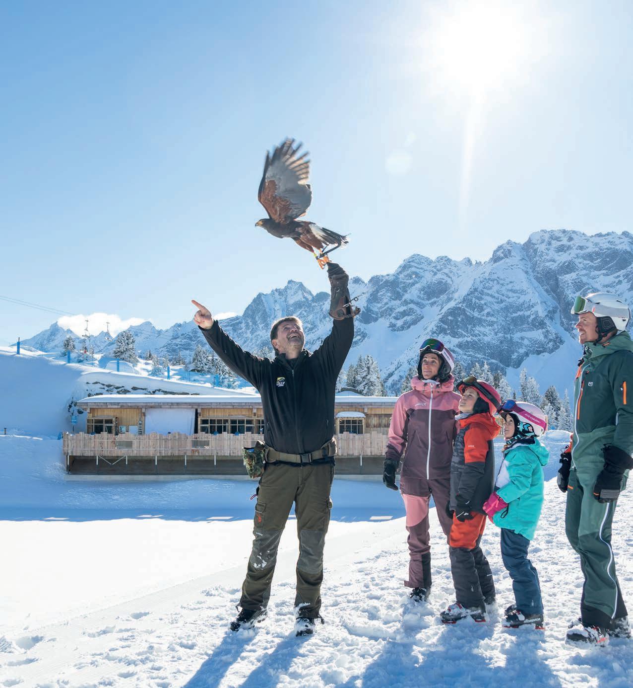 Wenn Falkner Didi Wechselberger dieses Schauspiel beschreibt, dann kommt er rasch ins Schwärmen: „Die Vögel fliegen vor diesem umwerfenden Panorama, bei glitzerndem Schnee, über den Speichersee. Richtig kitschig ist das, ich kann’s gar nicht anders sagen.“ Die Vogelbeobachtung lässt sich dabei ideal mit einer Winterwanderung verbinden. Rund um den Speicherteich gibt es außerdem Infostationen, die Herkunft und Sinn der Falknerei beschreiben.