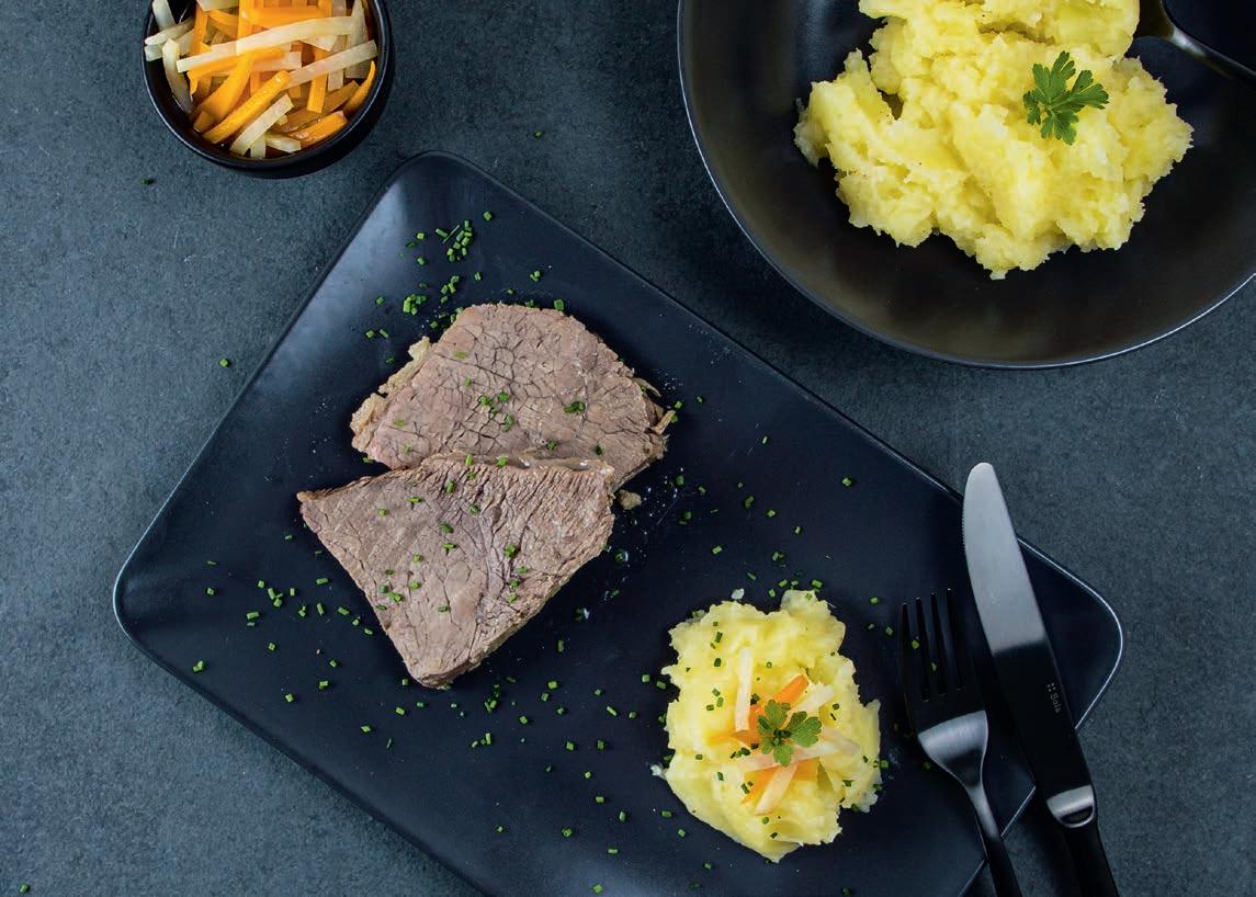» Karotten und Sellerie in Stifte schneiden und einige Minuten in Salzwasser bissfest kochen. Auf dem Stampf anrichten und eine Scheibe Tafelspitz dazugeben.