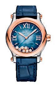 36 mm . Die Happy-Sport-Kollektion ist das Sinnbild für die Kreativität und Stärke von Chopard. Ihre verspielten, frei wirbelnden Diamanten tanzen zwischen zwei Saphirgläsern und fangen seit 1993 die Vorstellungskraft ein, als Chopard das erste Unternehmen war, das Edelstahl und Diamanten kombinierte. 11.700 Euro