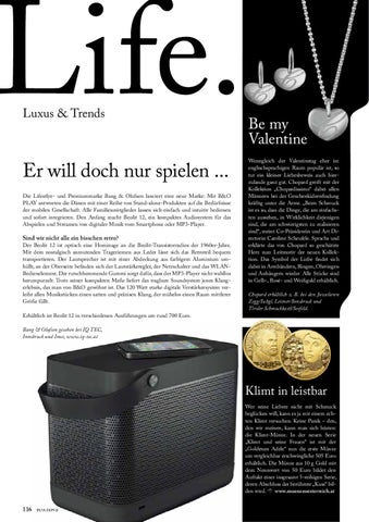 Be my Valentine Wenngleich der Valentinstag eher im englischsprachigen Raum populär ist, so tut ein kleiner Liebesbeweis auch hierzulande ganz gut. Chopard greift mit der Kollektion „Chopardissimo“ dabei allen Männern bei der Geschenkideenfindung kräftig unter die Arme. „Beim Schmuck ist es so, dass die Dinge, die am einfachsten aussehen, in Wirklichkeit diejenigen sind, die am schwierigsten zu realisieren sind“, meint Co-Präsidentin und Art Directorin Caroline Scheufele. Sprachs und erklärte das von Chopard so geschätzte Herz zum Leitmotiv der neuen Kollektion. Das Symbol der Liebe findet sich dabei in Armbändern, Ringen, Ohrringen und Anhängern wieder. Alle StĂźcke sind in Gelb-, RosĂŠ- und WeiĂ&#x;gold erhältlich. Chopard erhältlich z. B. bei den Juwelieren Zegg/Ischgl, Leitner/Innsbruck und Tiroler Schmuckkastl/Seefeld.