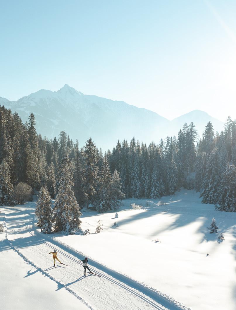 gehörte dabei zu den ersten, die Wege speziell präparierte und beschilderte, um ein sanftes und naturnahes Urlaubsangebot zu schaffen. Insgesamt sind es aktuell 142 Kilometer geräumte Wege, die sich durch die Region ziehen und ideale Bedingungen für entspannte Spaziergänge und gerne auch längere Touren inmitten unberührter Natur bieten. Ein ganz besonderes Erlebnis ist der 1. Winterweitwanderweg Tirols, mit dem die Seefelder bereits 2018 den sanften Wintertourismus revolutioniert haben. Auf vier Etappen taucht man ein in die magische Ruhe, unterschiedliche Übernachtungsstationen (samt komfortablem Gepäckservice) führen einmal quer durch die Region. Auch auf den fünf Etappen der Seefelder Hochplateau-Winterweitwanderung lernt man die Vielfalt der Region auf einzigartige Weise kennen. Die Mehrtagestour ist sternförmig angelegt, die Routen führen jedoch im Gegensatz zum Weitwanderweg immer wieder an den Ausgangspunkt in Seefeld zurück. Je nach Wetter, Lust und Laune lassen sich die Etappen verkürzen, verlängern oder verbinden, um den Winter in all seinen Facetten zu erleben – mal ruhig und besinnlich, mal aktiv und abenteuerlich.
