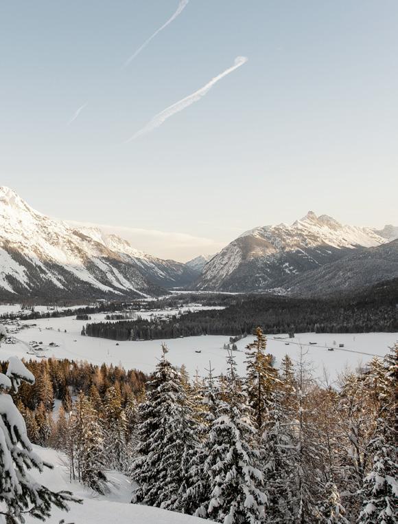 why the pasture bears the name of the valley. It lies in the middle of a scenic natural spectacle, where the majestic mountain panorama surrounds visi tors in peaceful white in the winter months, giving it an almost abstract softness.