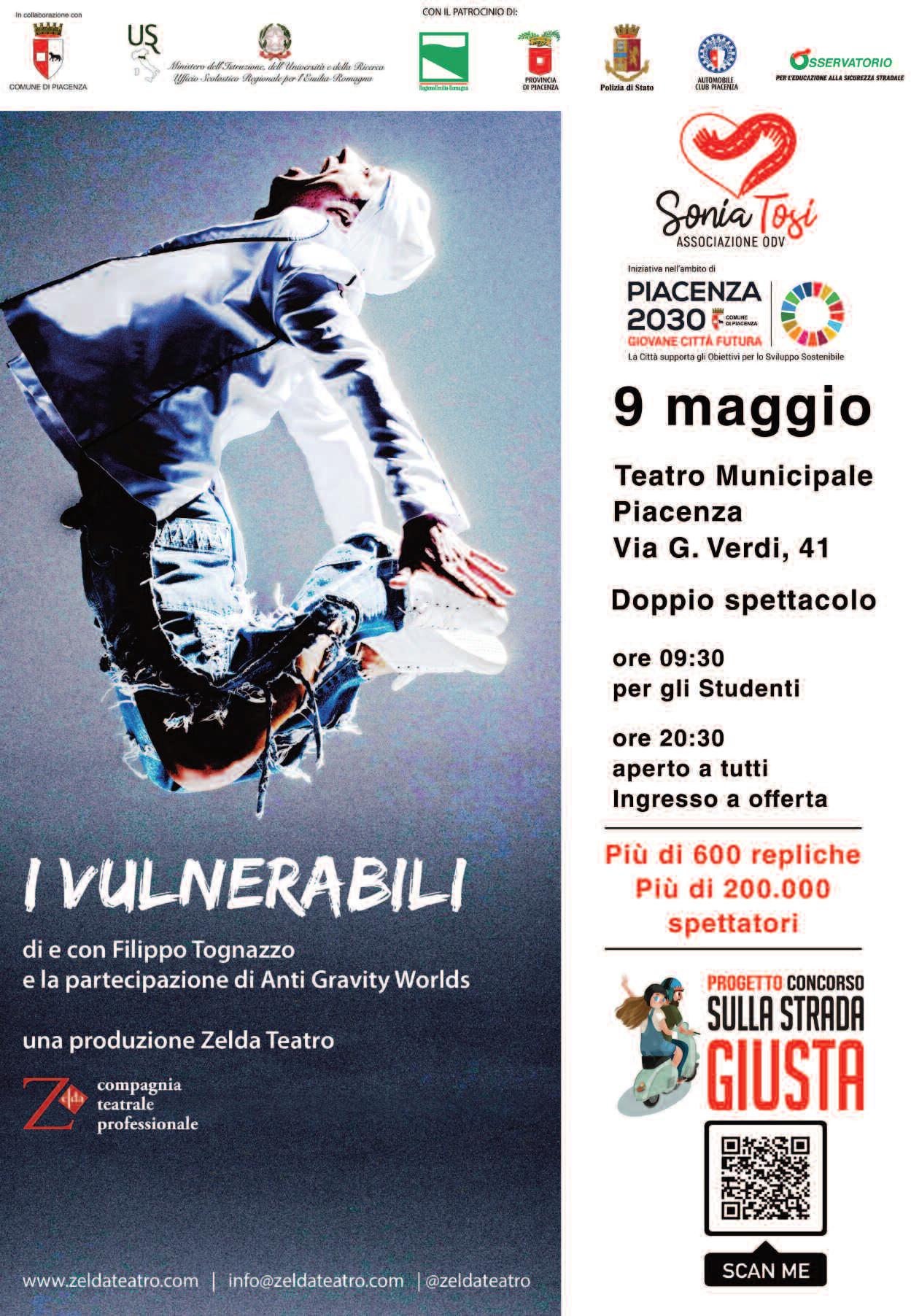 “I Vulnerabili”, la sicurezza stradale a teatro Così si può riassumere lo spettacolo che andrà in scena, giovedì 9 maggio, al Teatro Municipale di Piacenza, in occasione della giornata conclusiva della seconda edizione del Progetto/Concorso “Sulla Strada Giusta” Ci sarà una doppia rappresentazione, al mattino, alle ore 9:30 per gli studenti che hanno partecipato al progetto e alle 20:30 per tutta la cittadinanza con ingresso ad offerta La giornata, in particolare, vedrà al mattino la premiazione del progetto/concorso che ha visto la preparazione da parte dei ragazzi di spot tipo pubblicità progresso sulla sicurezza stradale, tema che sarà anche al centro dello spettacolo “I Vulnerabili”, messo in scena dalla compagnia Zelda di Venezia Ogni minuto, nel mondo, 2 persone muoiono per incidenti stradali: sono oltre 3 000 persone al giorno, 1 200 000 all’anno Di questi, circa un quarto sono giovani fra i 18 e i 35 anni L OMS e l Istituto Superiore di Sanità hanno rilevato che gli incidenti stradali sono fra le prime causa di morte per i giovani fra i 10 e i 24 anni In Italia si contano ogni anno quasi 3 000 morti sulla strada e oltre 250 000 feriti Le campagne di sicurezza stradale sono perciò un fondamentale strumento di prevenzione per tutelare salute e futuro dei ragazzi Con questi dati così drammatici la compagnia Zelda, in collaborazione con l Associazione Per non dimenticare, ha prodotto “I Vulnerabili”, uno spettacolo innovativo, dinamico e coinvolgente Con un